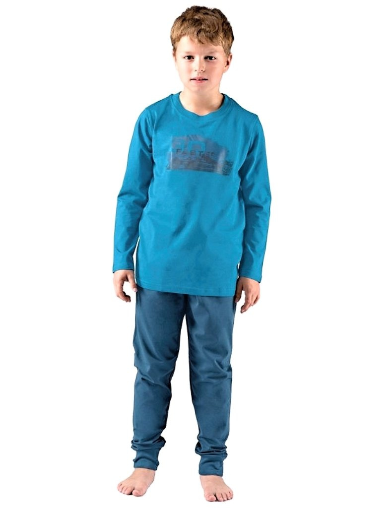 Představujeme chlapecké pyžamo s dlouhým rukávem a potiskem formule, vyrobené z jemné bavlny. Dlouhé kalhoty mají jednobarevný design, manžety a regulaci v pase pomocí tkaničky pro pohodlné nošení. Baleno v PP sáčku | vyrobeno v České republice | značka – Gina | chlapecké pyžamo, model 69003P | 100% Bavlna.