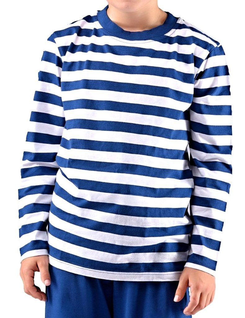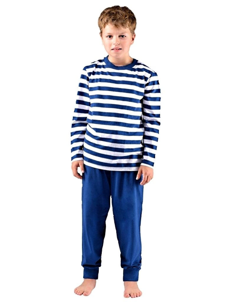 Atraktivní chlapecké dlouhé pyžamo se skládá z trika s kruhovým výstřihem a pruhovaným vzorem, a dlouhých jednobarevných kalhot s manžetami a stahovací tkanicí v pase pro pohodlné nošení. Baleno v PP sáčku | vyrobeno v České republice | značka – Gina | chlapecké pyžamo, model 69005P | 100% Bavlna.