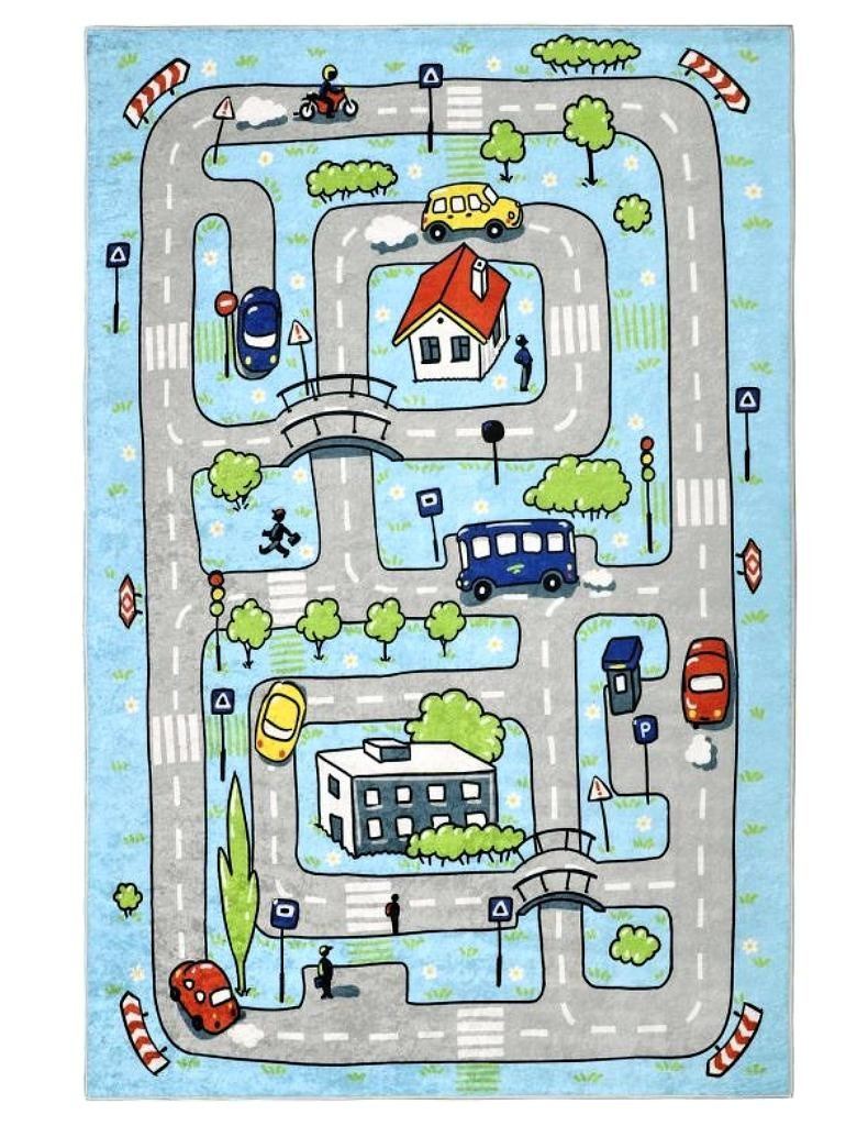 Dětský koberec 3040-209 s motivem modré autodráhy vyniká živými barvami a hravým designem. Tento elegantní koberec má protiskluzový latexový nátěr, takže zajišťuje bezpečnost pro vaše děti. Více informací