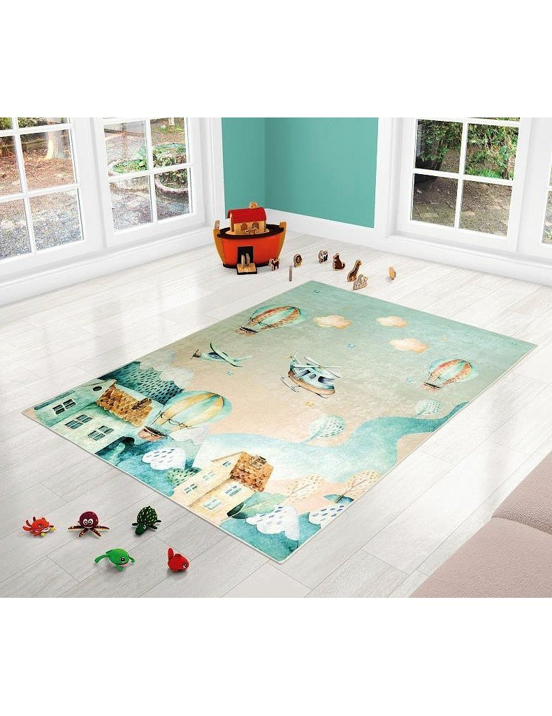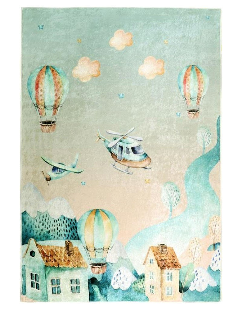 Dětský koberec 3040-211 se zeleným potiskem inspirovaným motivy balónů představuje kvalitní produkt s protiskluzovým latexovým povrchem. Tento koberec je ideálním řešením pro hry v dětském pokoji.
