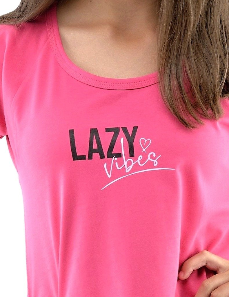 Dívčí noční košile z kvalitní bavlny je ideální pro pohodlný spánek. Má krátké rukávy, jednobarevný design a výrazný potisk. Délka košilky dosahuje ke kolenům, což zajišťuje komfort a volnost pohybu.