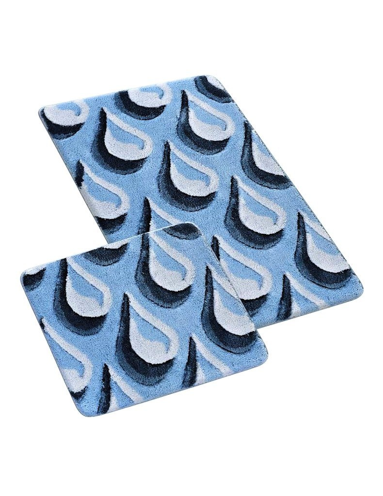 Doporučujeme sadu Ultra koupelnových předložek z kolekce Kapky v modrých odstínech s vyšším vlasem. Tyto předložky mají protiskluzový povrch a jsou navrženy bez výseku pro WC, ideální pod zavěšené toalety.