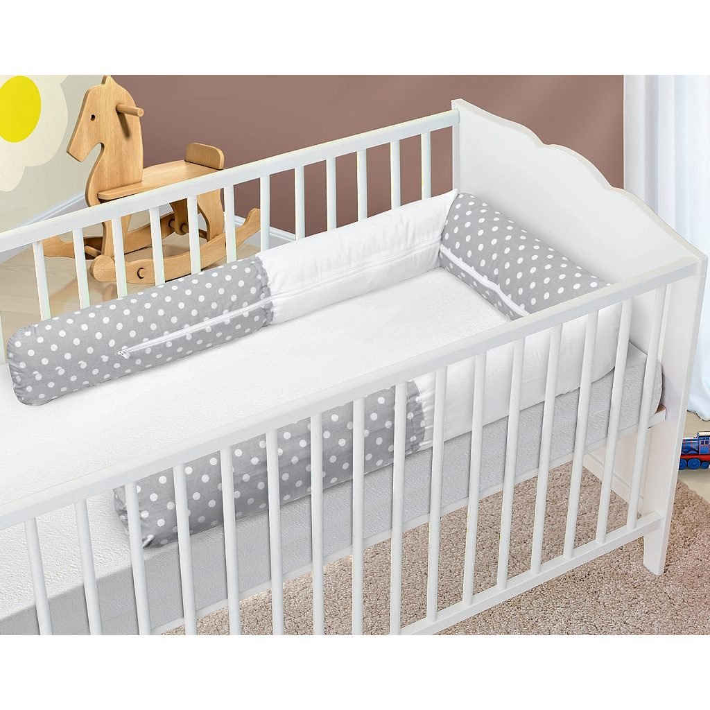Mantinel do postýlky, válec v délce 240 cm a průměru 12 cm pro bezpečné snění miminka. Ochrana dítěte proti nechtěnému poranění. Zábrana je rozdělena všitou pruženkou na několik dílů pro lepší manipulaci v posteli. Bavlněný potah je osazen zipovým uzávěrem pro pohodlné praní. Baleno volně v pytli PP | značka – Bellatex | vyrobeno v České republice | puntík šedá, bílá 3222/903 | materiál povlaku - 100 % Bavlna (Agáta) | materiál výplně – kuličky ze 100 % Polyesterového vlákna (pevně zašité v netkané textilii).