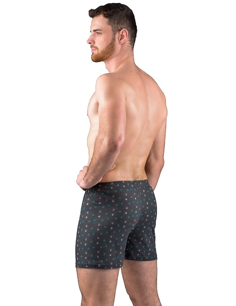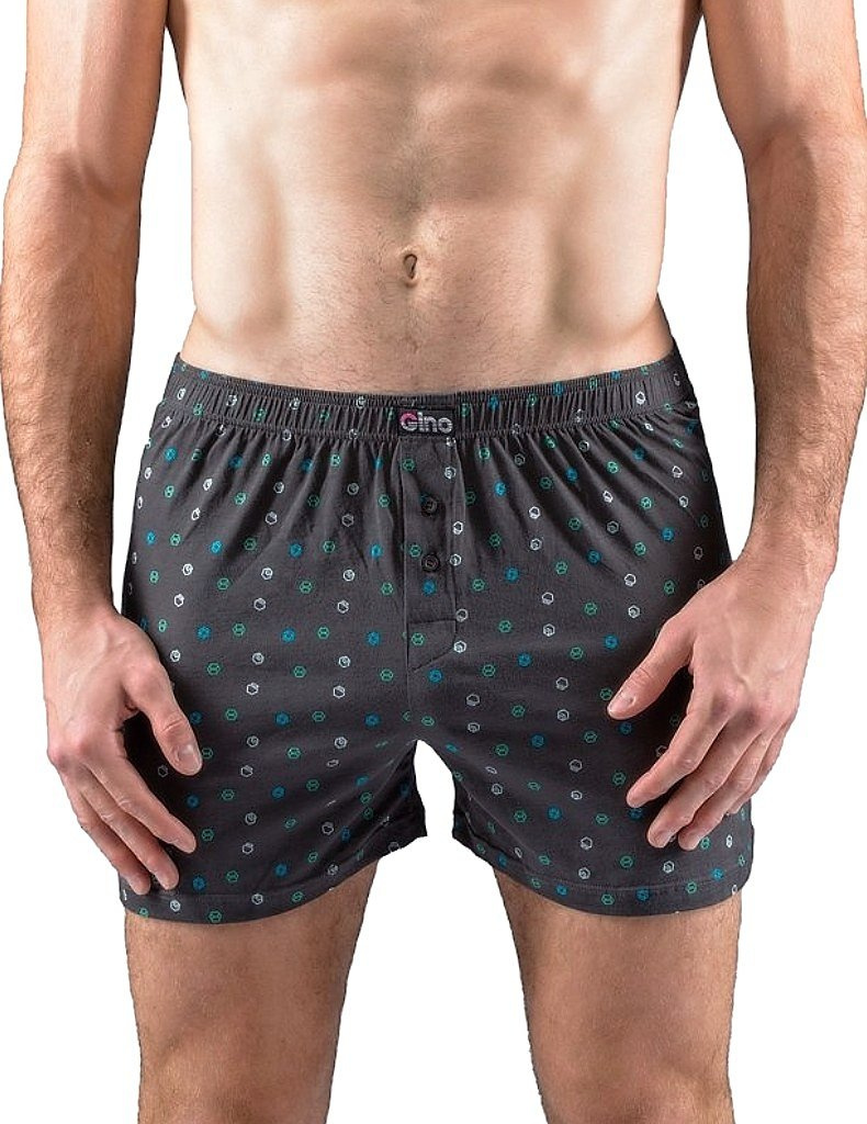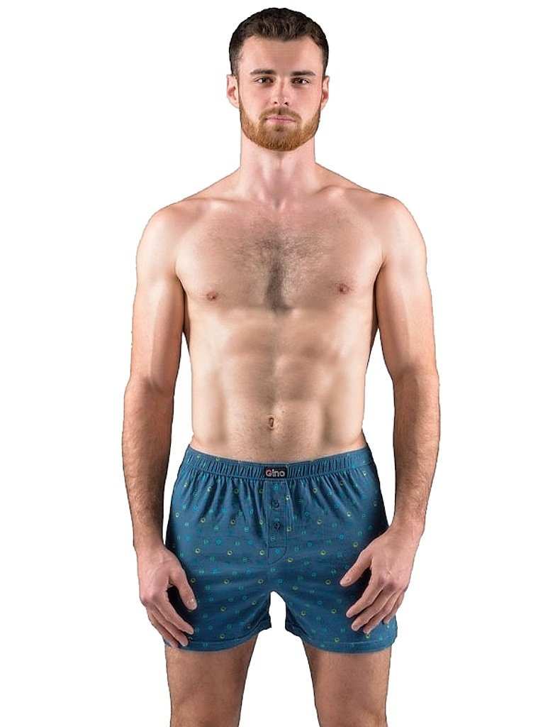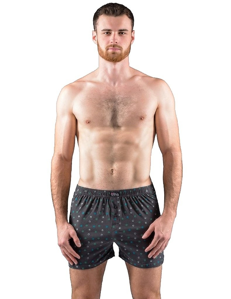 Pánské trenky model 75203 od Gina, šité ze 100% bavlny. V pase širší pruženka, nohavice s podehnutím. Přední díl má rozparek na 2 knoflíky, zadní díl se středovým švem. Trenýrky s drobným potiskem. Více informací