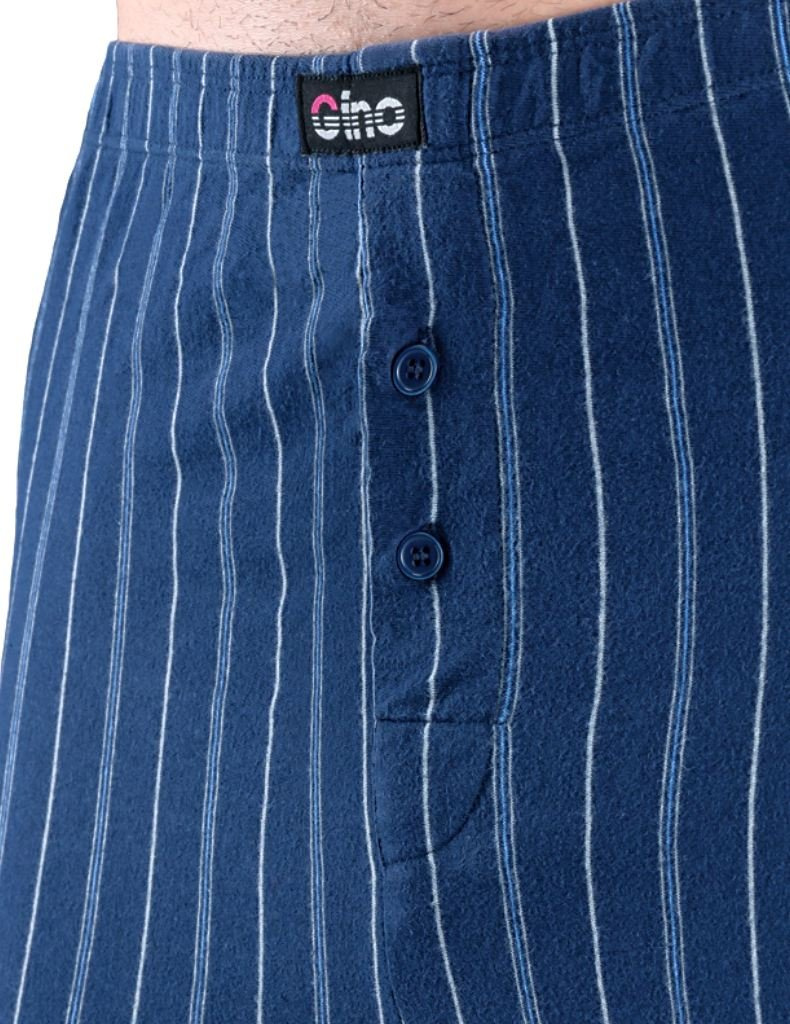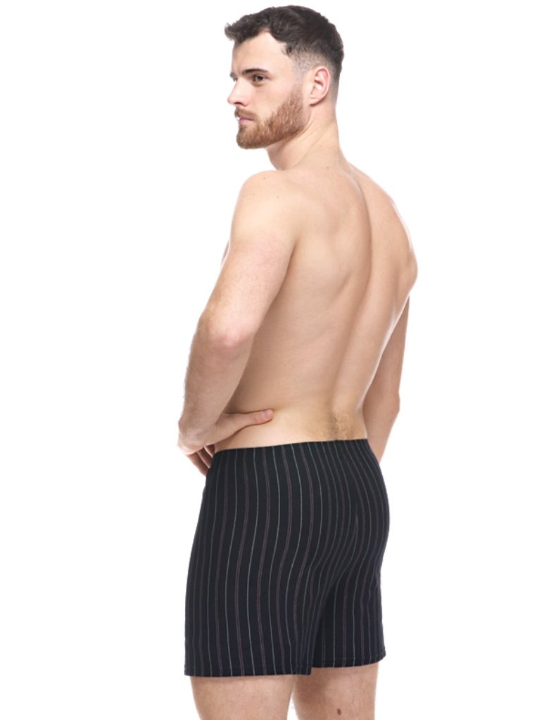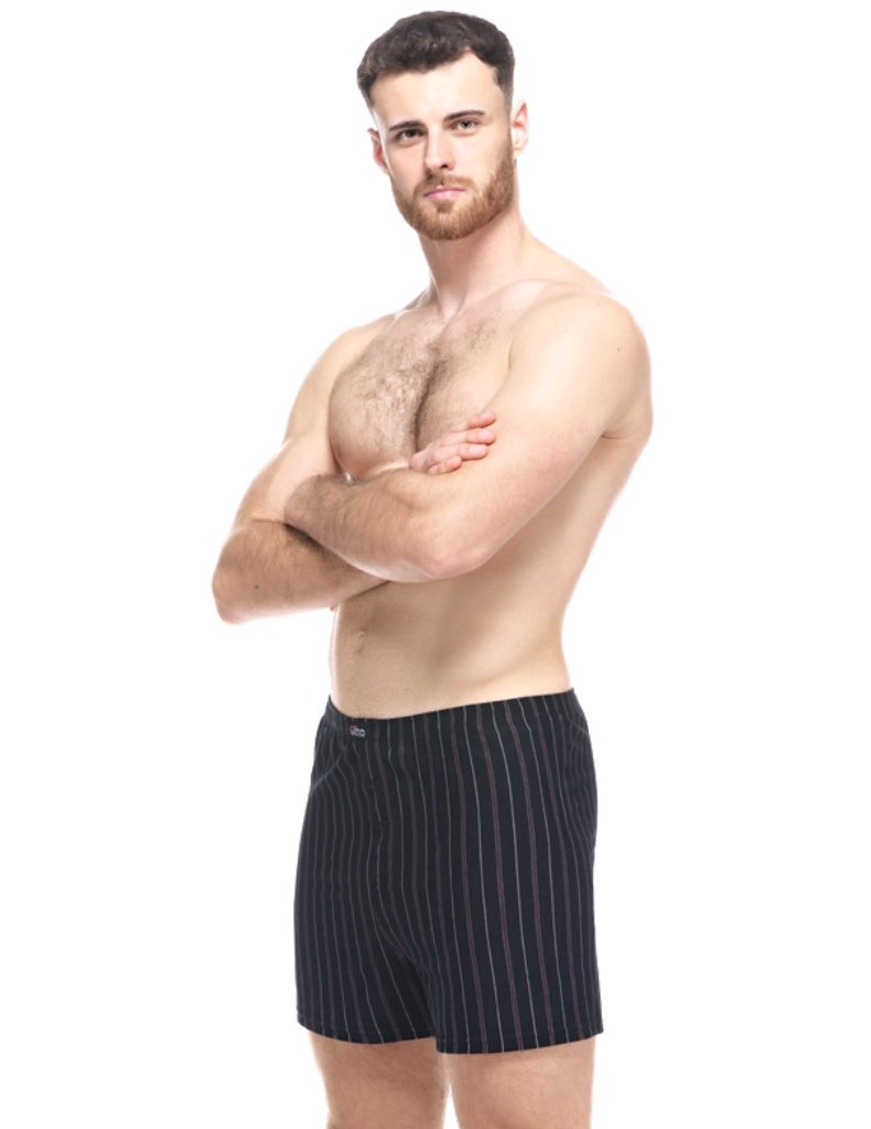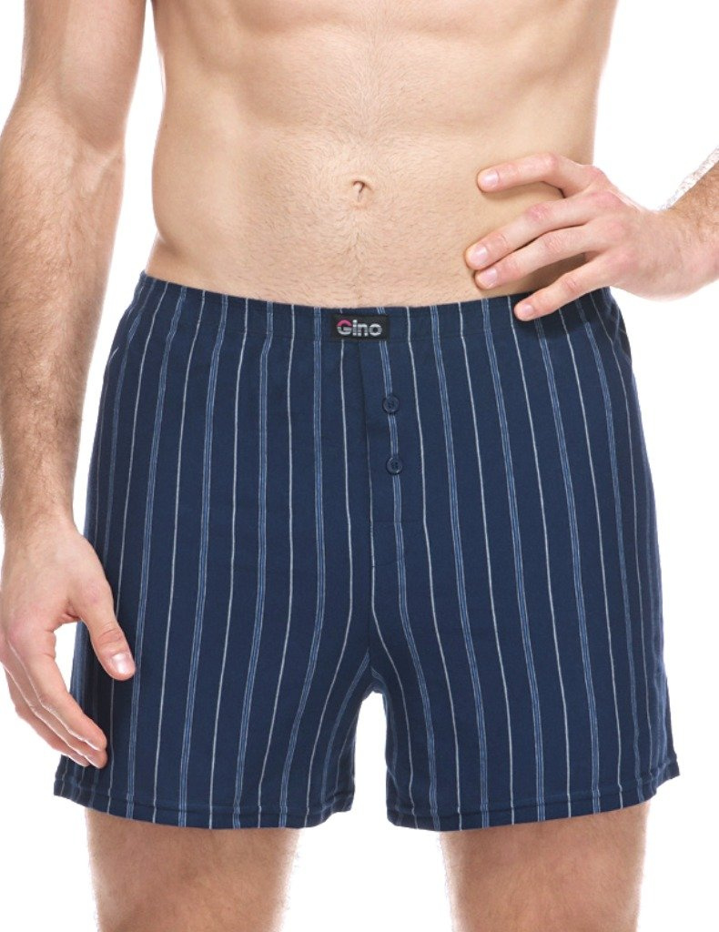 Pánské volné trenky model 75209 ze 100% bavlny jsou ideální pro muže, kteří preferují pohodlný střih a pruhovaný potisk. Mají elastickou pasovou gumu a rozparek s knoflíky.