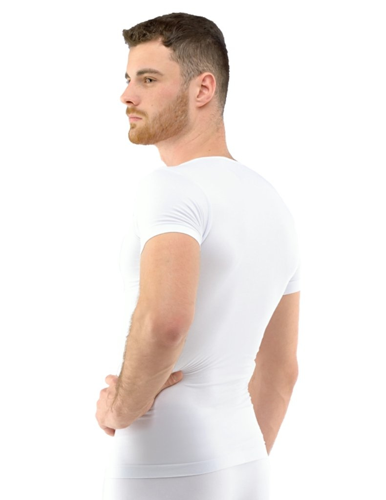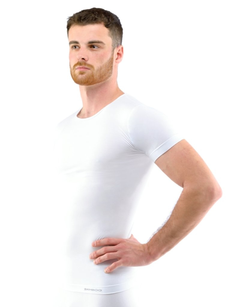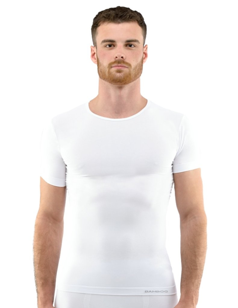 Pánské bambusové tričko V-58006 od značky Pleas v doprodeji. Bílé elegantní bezešvé tričko s krátkým rukávem, dolní okraj bezešvě zakončený, výstřih je začištěn dekorativním proužkem.