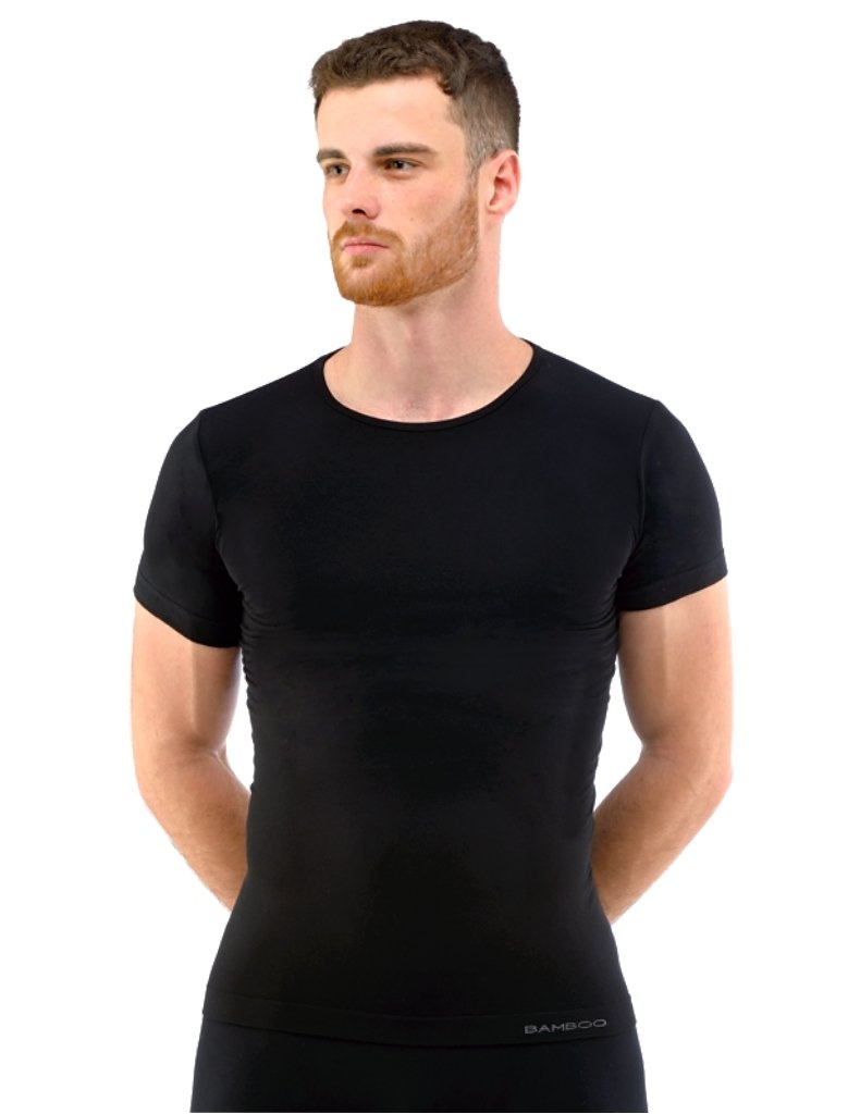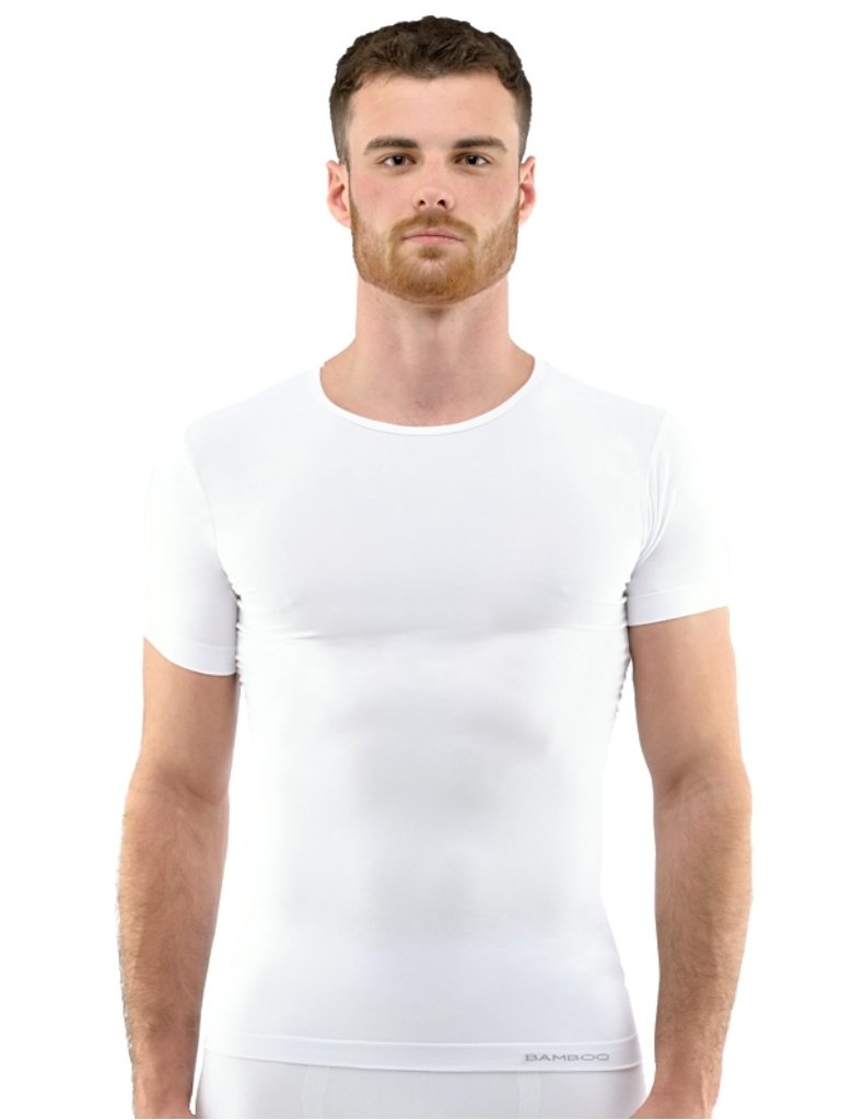 Pánské tričko 58003 od značky Gina je moderní oblečení s krátkými rukávy, vyrobené ze 70 % bambusu, 22 % polyamidu a 8 % elastanu. Má bezešvý dolní lem a lemovaný výstřih v jednobarevném provedení.