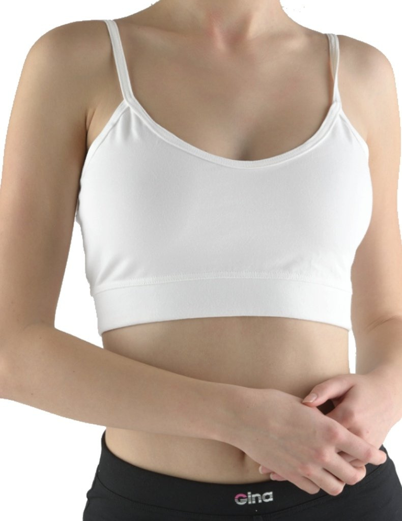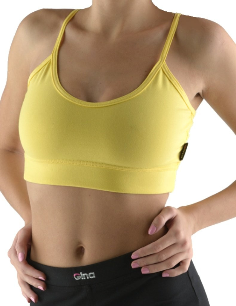 Podprsenka sportovní doprodej V-97005 od značky Gina. Jednobarevný top pro ženy s pevnými úzkými ramínky a elastickým dolním širokým pasem, z úpletu z 90 % bavlny a 10 % elastanu. V ramínkách a výstřihu je všita pruženka.