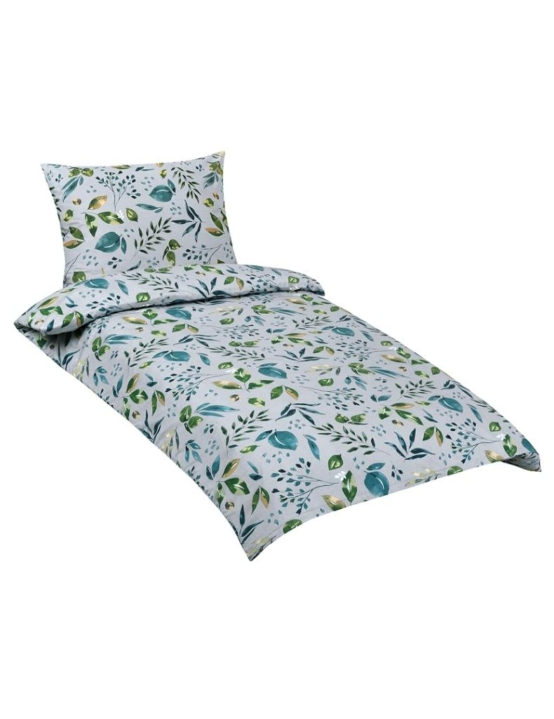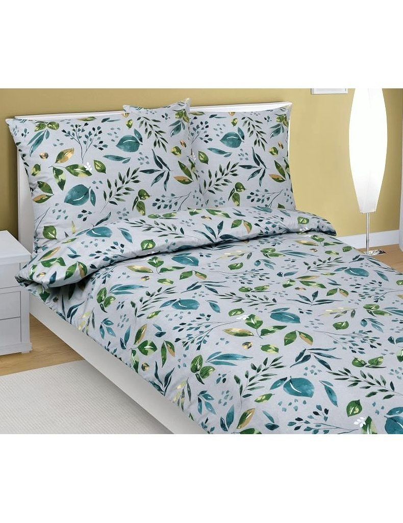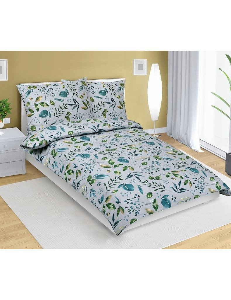 Lůžkovina je balena do obalu z PP a papírové spony | značka - Bellatex | vyrobeno v České republice | bavlněné povlečení, model Lupínek 90/644 | barevné odstíny – zelené a šedé | 100% Bavlna.