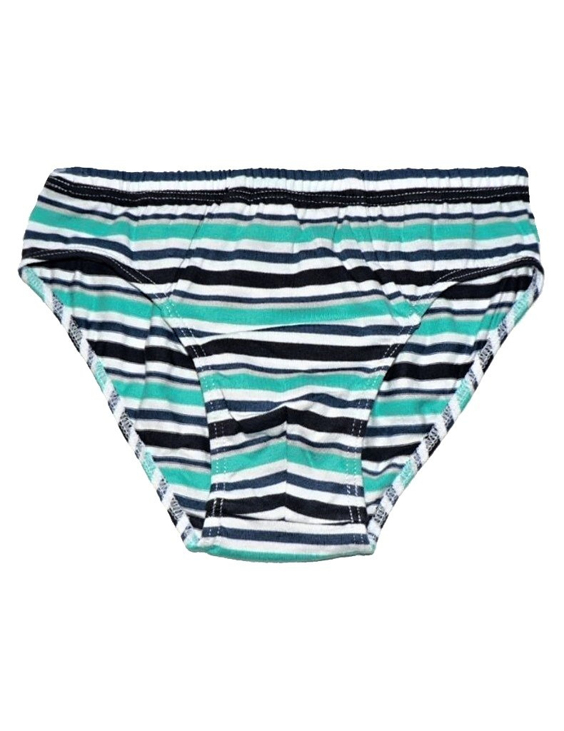 Detské slipy V-318734 sú v dopredaji. Táto chlapčenská spodná bielizeň je zdobená potlačou vodorovných prúžkov v tyrkysovej farbe. Pás je opatrený širšou elastickou gumou a nohavičky majú úzku gumu.