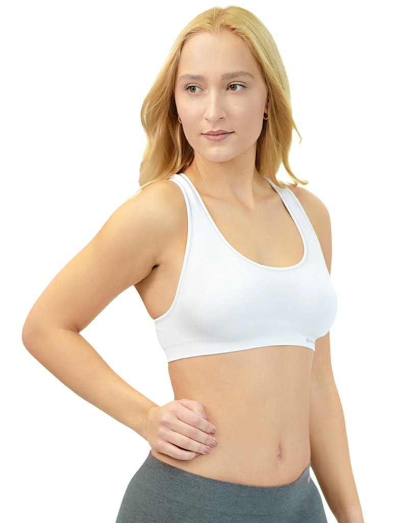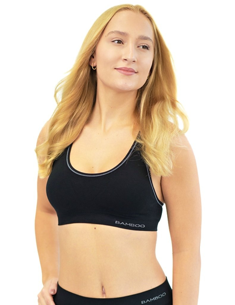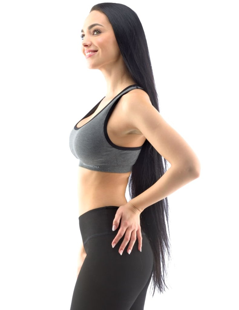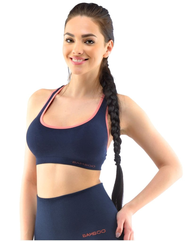 Sportovní podprsenka model 07018 bez kostic, s vyjímatelnými vycpávkami. Podprsenka z bezešvého úpletu má zesílený dolní kraj, dvojité vrstvy s lisovanými košíčky a křížová ramínka na zadním díle. Více informací