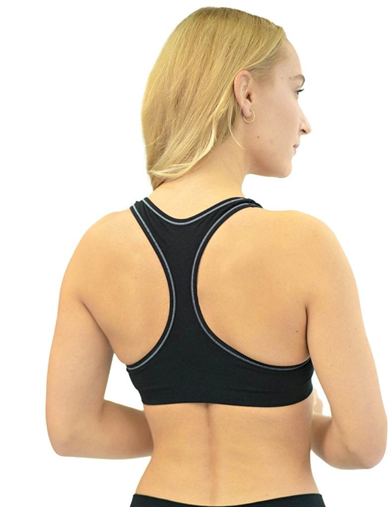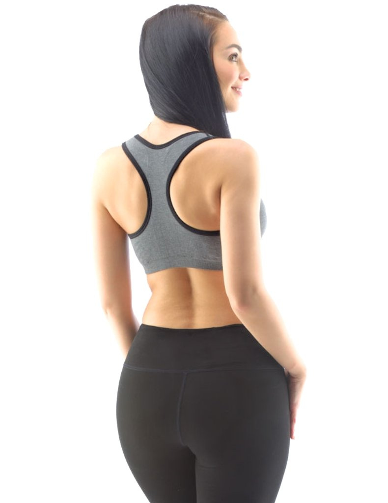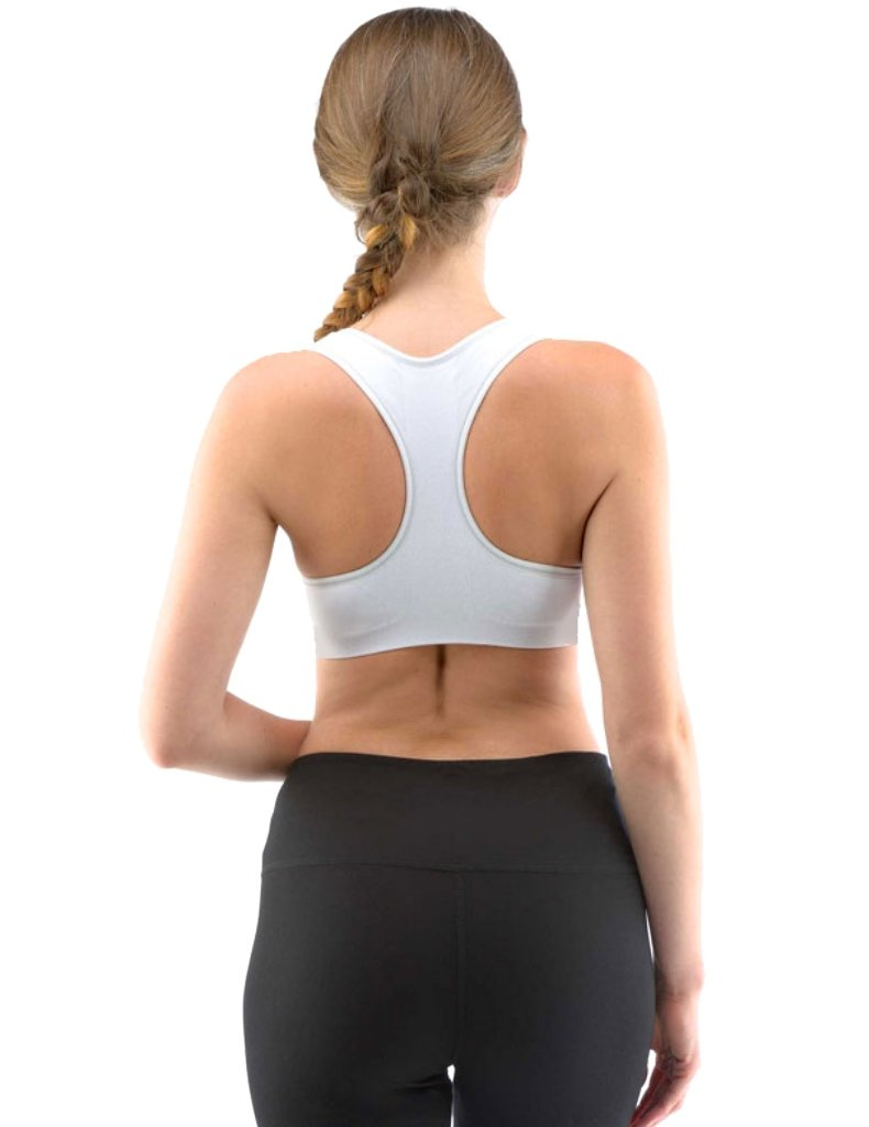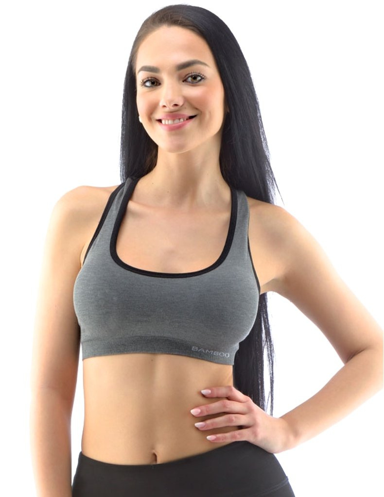 Sportovní podprsenka model 07018 bez kostic, s vyjímatelnými vycpávkami. Podprsenka z bezešvého úpletu má zesílený dolní kraj, dvojité vrstvy s lisovanými košíčky a křížová ramínka na zadním díle.