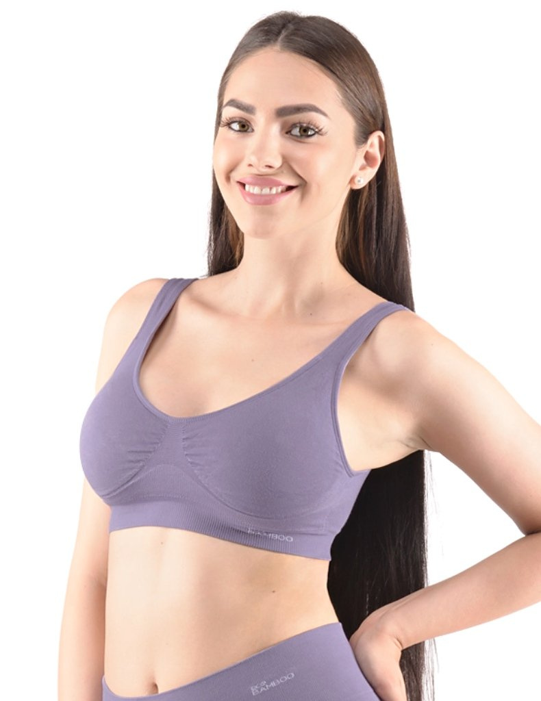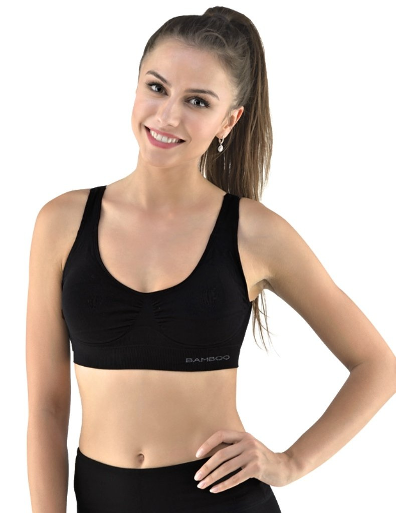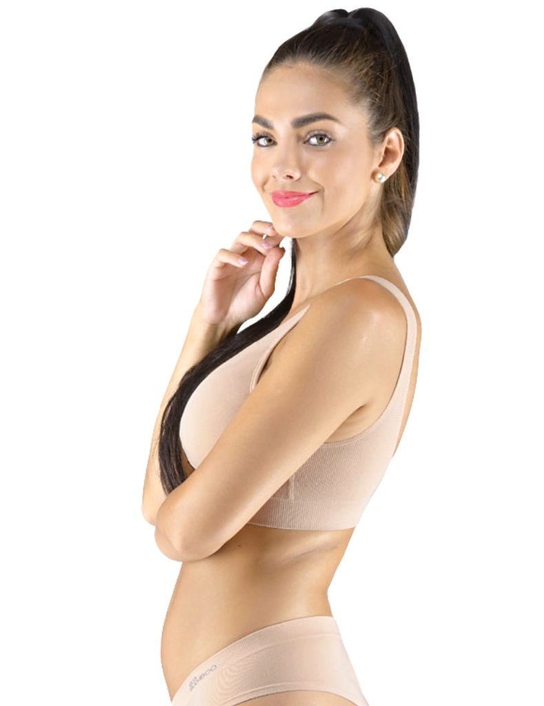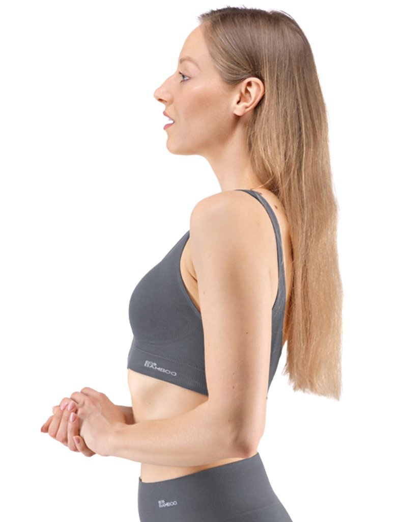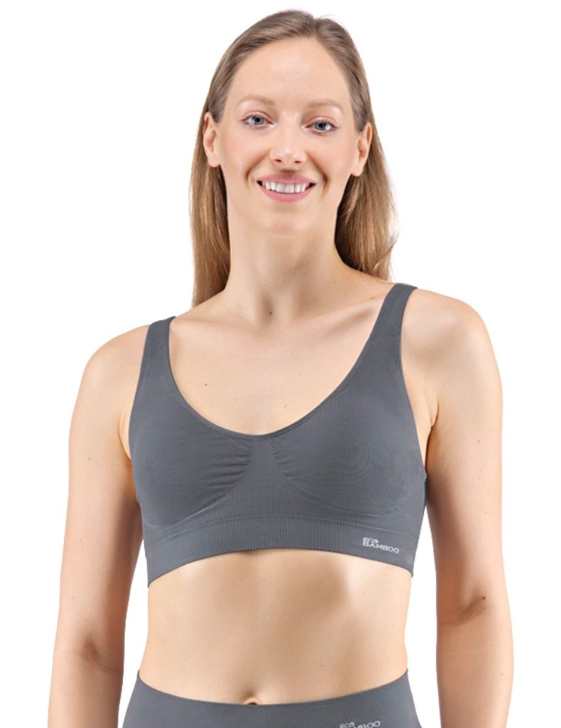 Sportovní podprsenku bez kostice 07014 eco Bamboo od Gina tvoří vyjímatelné vycpávky a bezešvý jednobarevný bambusový materiál. Dvojitý přední díl s lisovanými košíčky a zadní díl v celku.