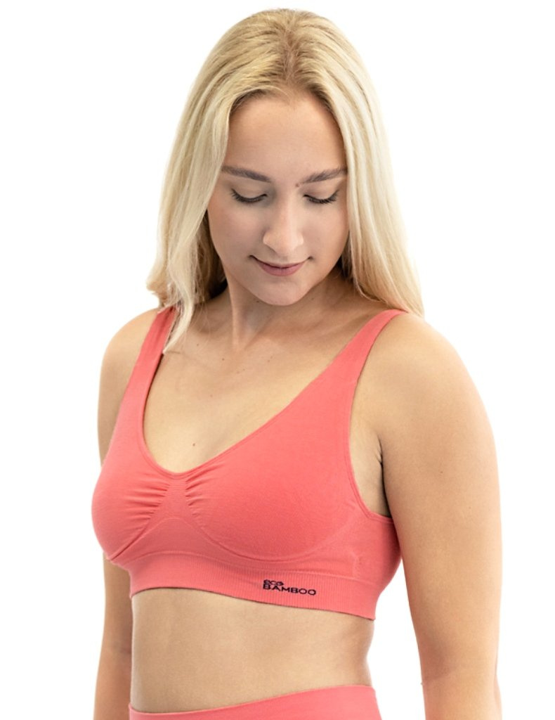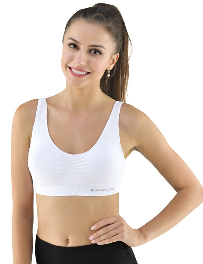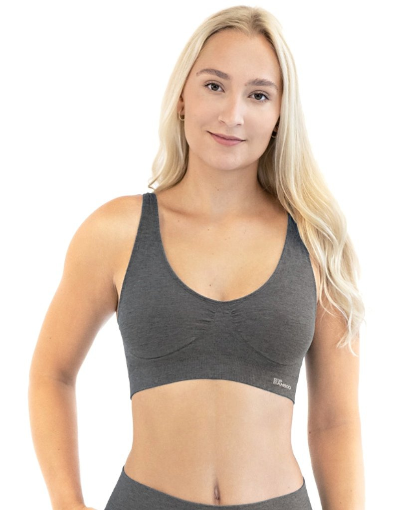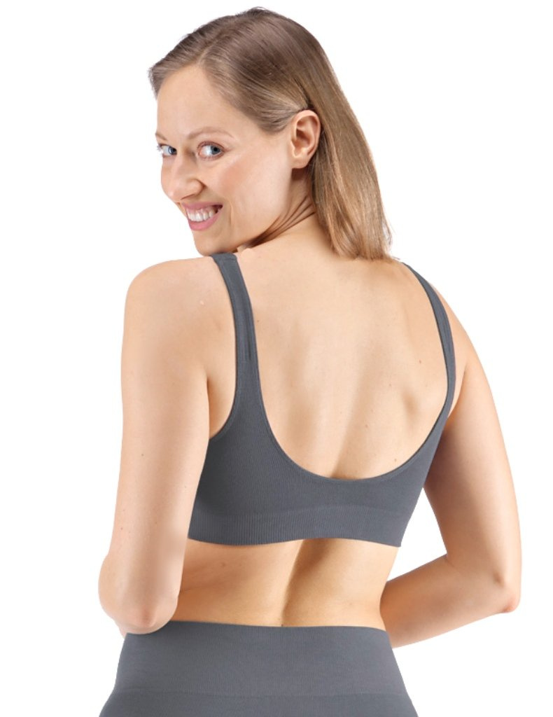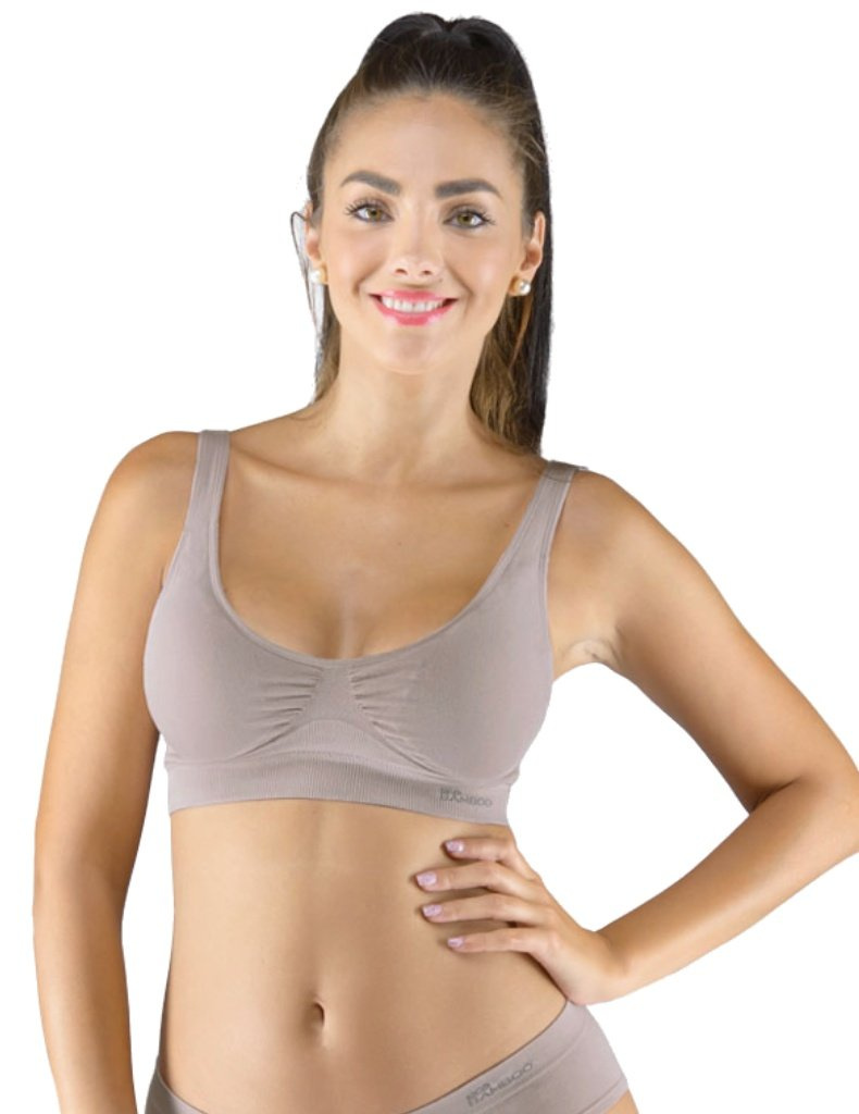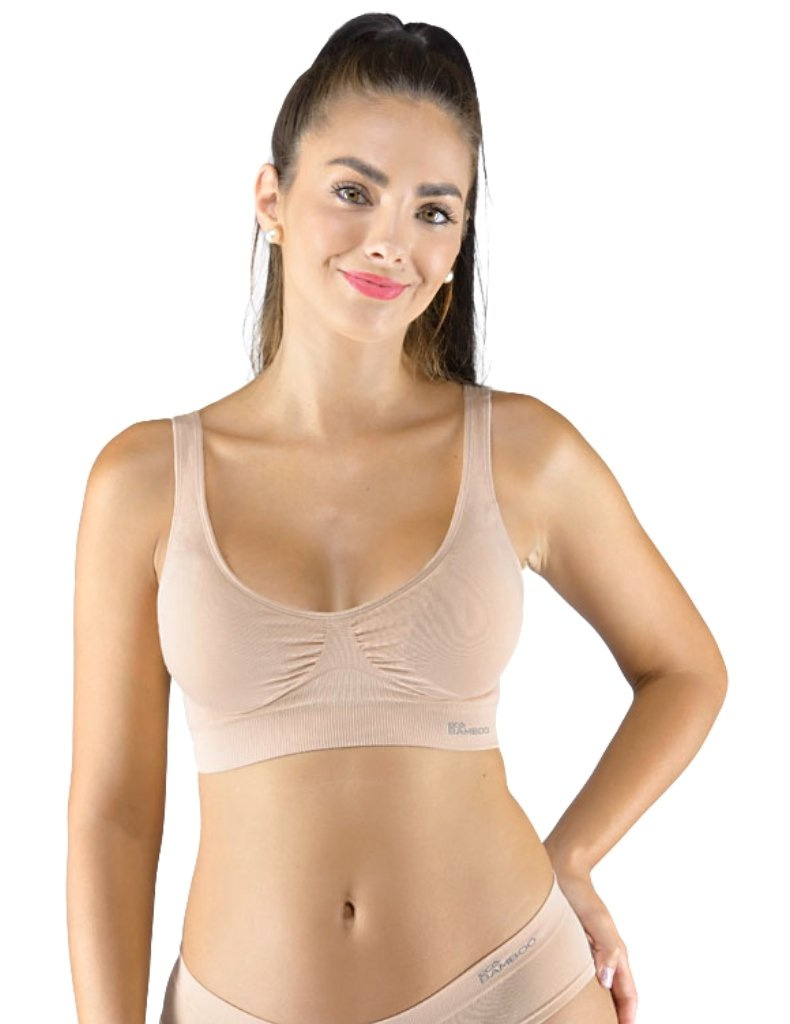 Sportovní podprsenku bez kostice 07014 eco Bamboo od Gina tvoří vyjímatelné vycpávky a bezešvý jednobarevný bambusový materiál. Dvojitý přední díl s lisovanými košíčky a zadní díl v celku.