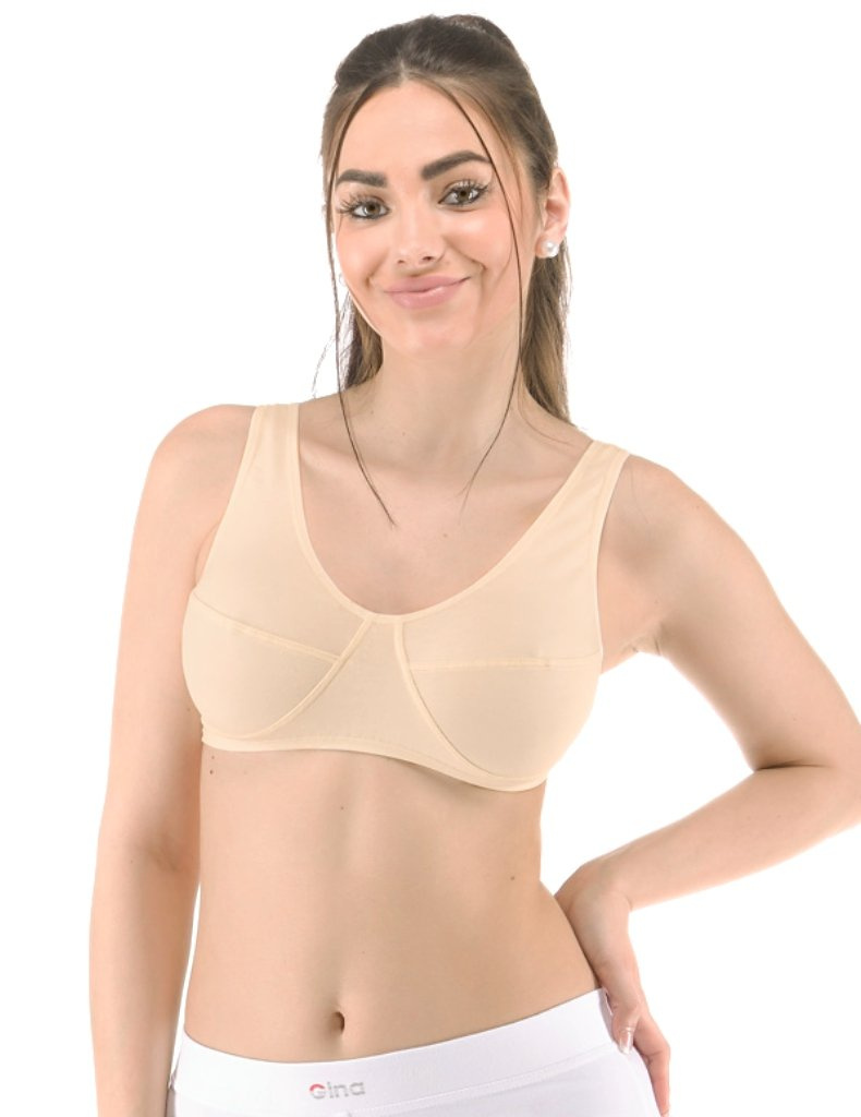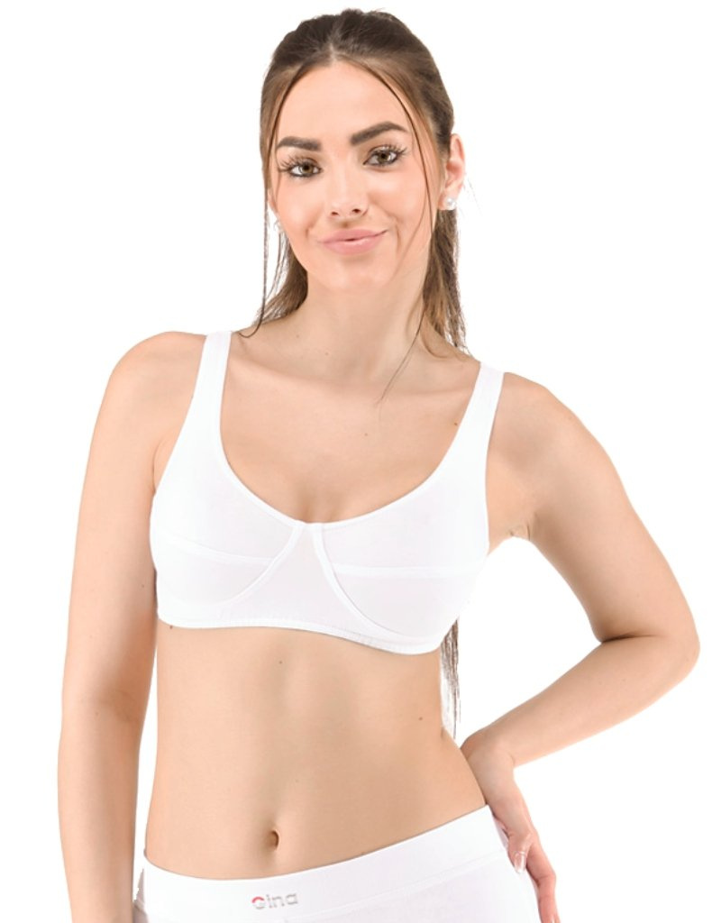 Sportovní podprsenka 97017 s širokými ramínky od značky Gina. Jednobarevné šité fitness prádlo pro ženy, z jemného úpletu 90 % bavlny a 10 % elastanu. V dolním kraji a dekoltu je zašitá úzká guma. Více informací