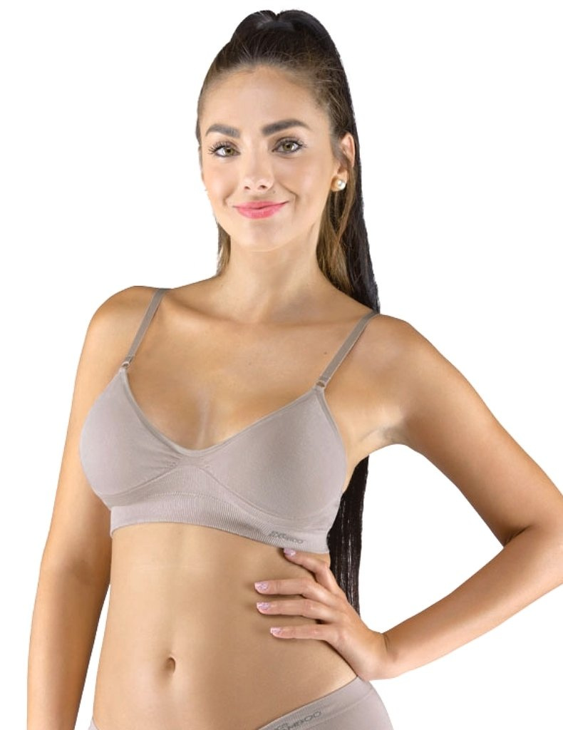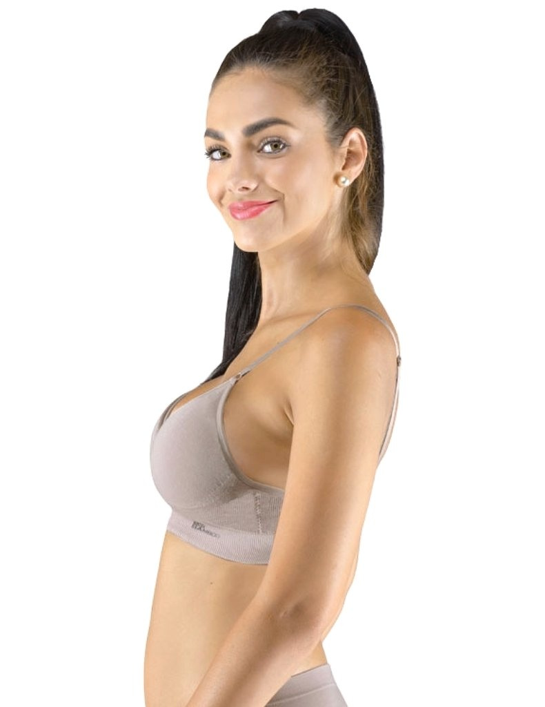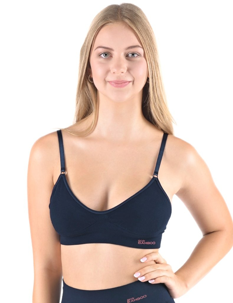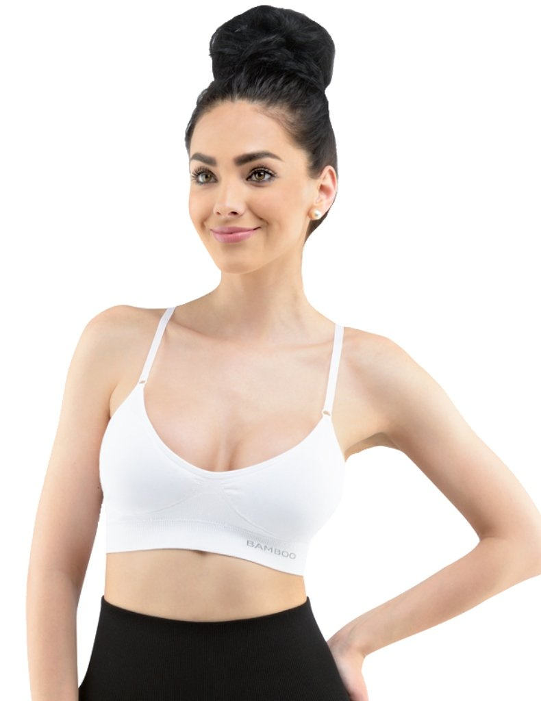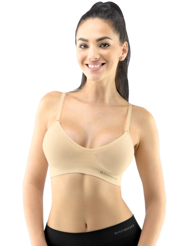Sportovní podprsenka 07021 s vyjímatelnými vycpávkami a nastavitelnými ramínky. Bezešvé eco Bamboo prádlo, zesílený dolní kraj a lemovaný horní kraj. Dvojitý přední díl s košíčky, zadní díl v celku.